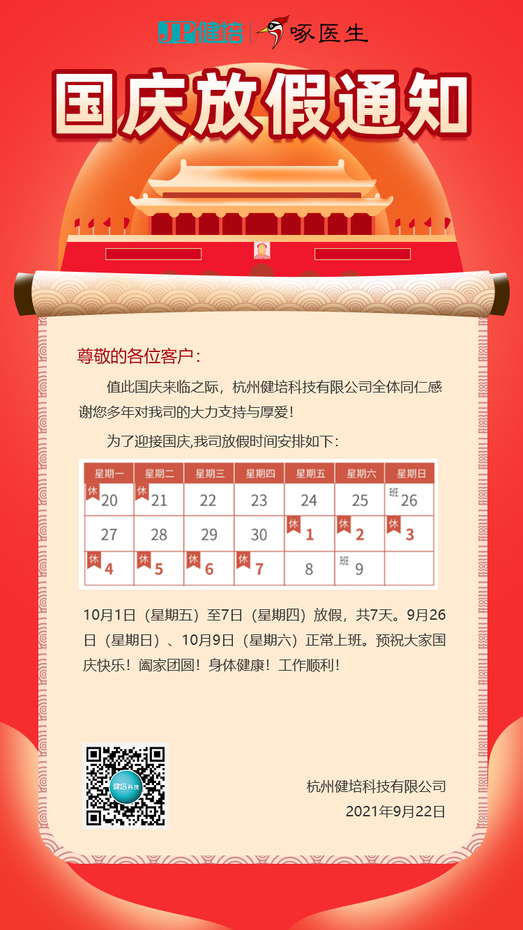 喜迎國慶,與AI相伴! 原創 健培科技2021/10/12 9:35:30 共譜盛世華章神州奮起,國家繁榮山河壯麗,歲月崢嶸江山不老,祖國常春值此國慶佳節之際健培祝祖國母親繁榮昌盛祝您和家人國慶節快樂!國慶節放假通知