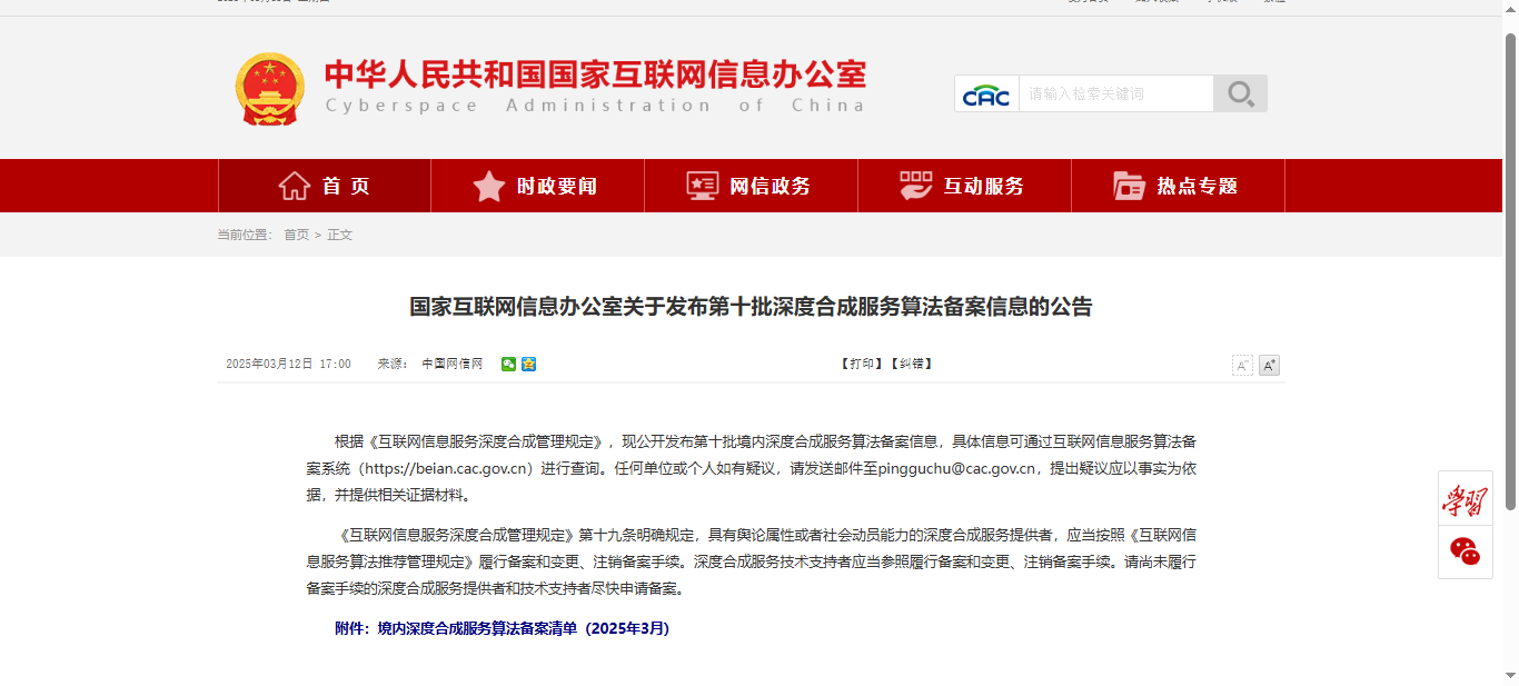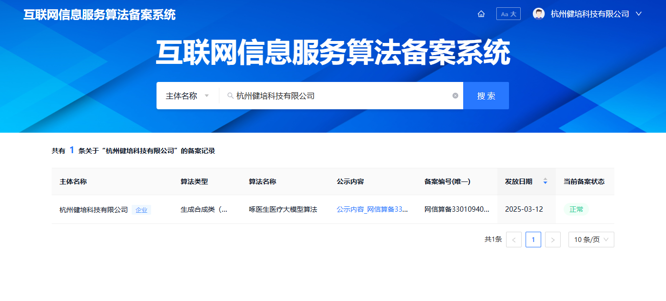 3月12日,國家互聯網信息辦公室發布了第十批深度合成服務算法備案信息的公告,?啄醫生醫療大模型榜上有名,這標志著我們的核心技術能力和產品合規性再次獲得權威認可,持續推動人工智能技術在醫療健康領域的深度應用。